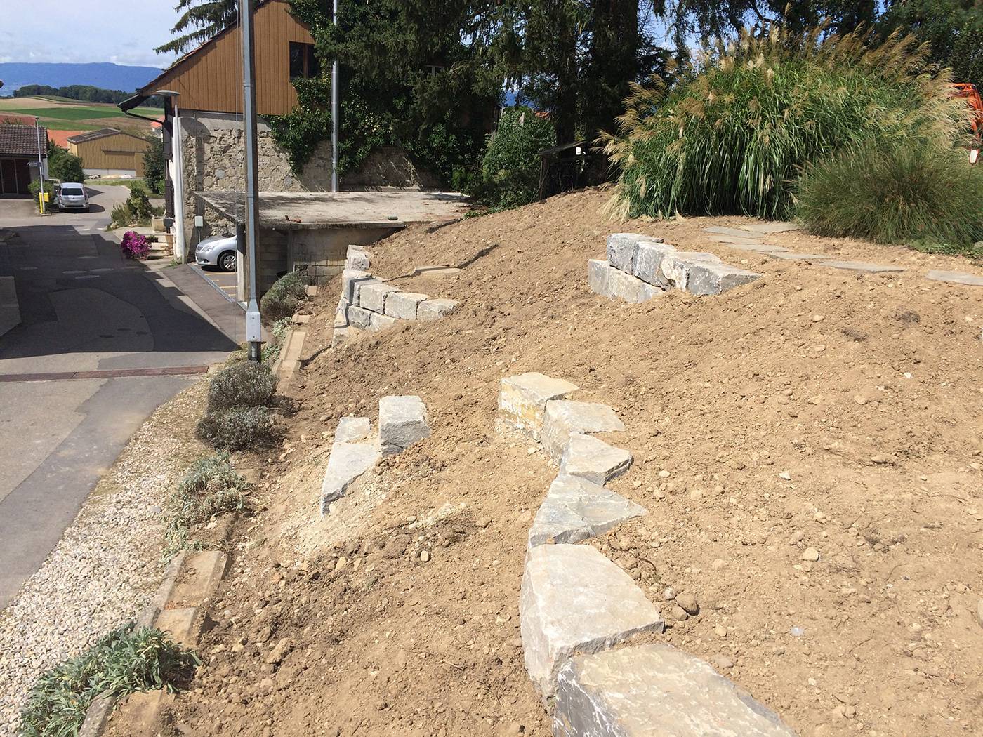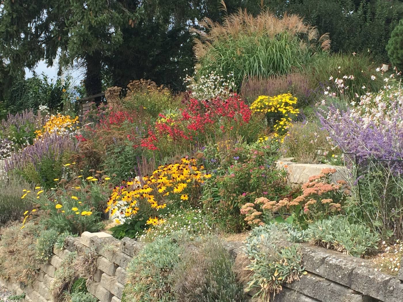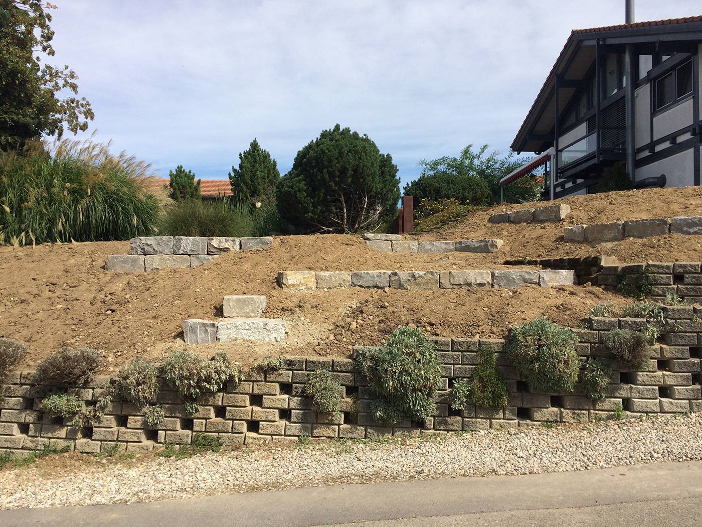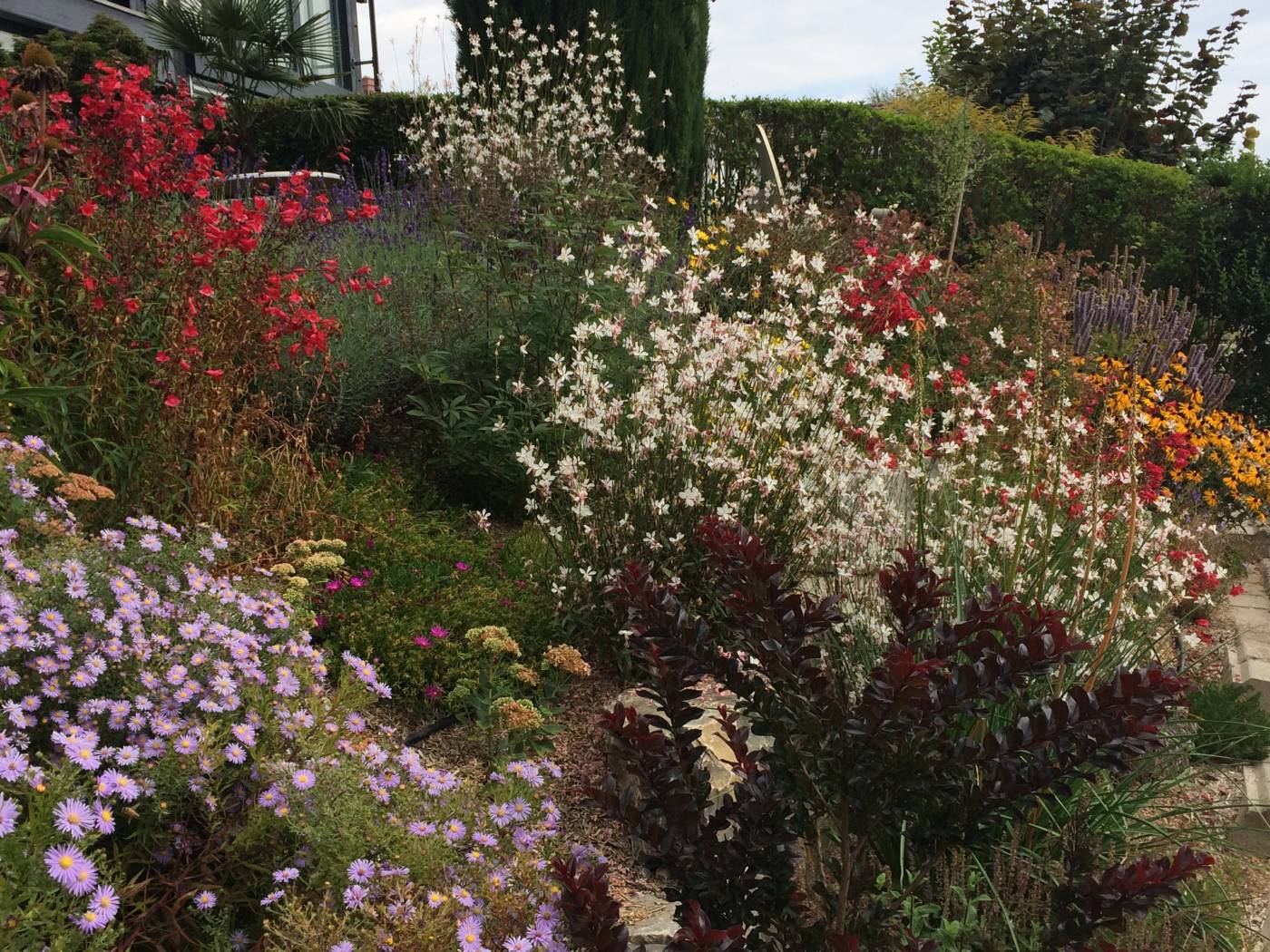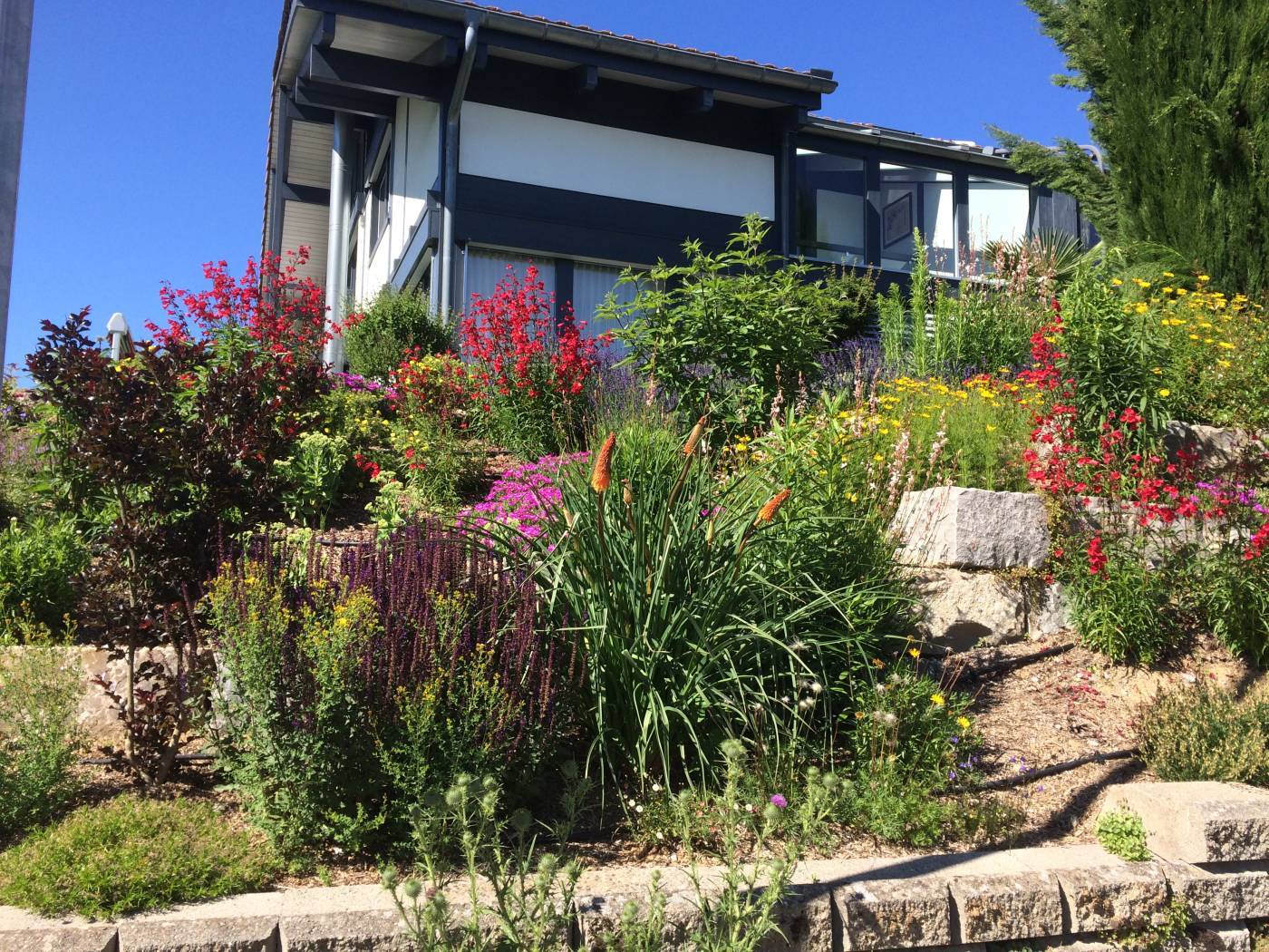 Diese Böschung war vor der Umgestaltung unstrukturiert, eintönig bewachsen und die hohen Thuja verdeckten die Sicht. Der Wunsch des Kunden war eine bunte Böschung, die vom Frühling bis in den Herbst blüht, zudem sollten alle Pflanzen attraktiv für Insekten sein. Um die Blütenzeit zu verfrühen wurden 300 Blumenzwiebeln gesteckt.